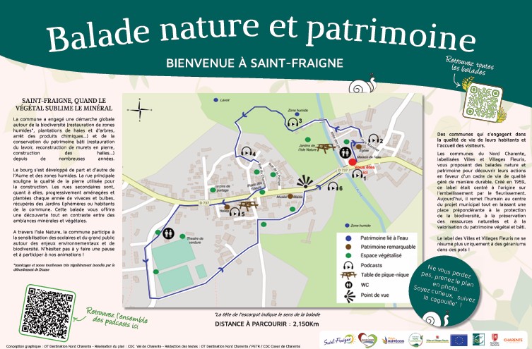 Ses jardins Éphémères ouverts de juin à octobre situés au cœur du marais de Saint-Fraigne, les jardins éphémères sont inondés chaque hiver, puis renaissent au printemps avec une nouvelle aventure végétale et culturelle. Chaque année, au printemps, artistes, paysagistes, plasticiens ou amateurs s’approprient et interprètent l’espace sur un nouveau thème, offrant aux visiteurs une balade ludique et colorée sur la période estivale.